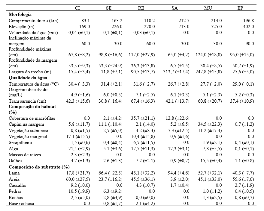 As variáveis físicas e químicas foram medidas utilizando-se equipamentos portáteis para pH (TECNOPON MPA-210), condutividade (μS/cm) (TECNOPON MCS-150), oxigênio dissolvido (mg/L) e temperatura (°C) (Lutron DO-5510). A transparência (cm) foi medida utilizando-se um disco secchi, e a velocidade da água (m/s) foi estimada usando o método flutuante (Maitland, 1990). O alcance do córrego ou morfologia do local foi avaliado pela largura média (cm) e profundidade (cm) retiradas de três transectos colocados ao longo do alcance do córrego, piscina ou reservatório. A composição do substrato e a estrutura do habitat foram estimadas em 9 a 12 pontos de pesquisa de 1 m2 medidos nas margens (ver Medeiros et al., 2008). Em cada ponto de pesquisa, foram estimadas as proporções (%) da composição de sedimentos (classificados como lama, areia, cascalho e seixos) e estruturas litorâneas e subaquáticas (por exemplo, macrófitas, capim, vegetação submersa, vegetação suspensa, folhiço, algas e galhos) (Pusey et al., 2004, Medeiros et al., 2008).