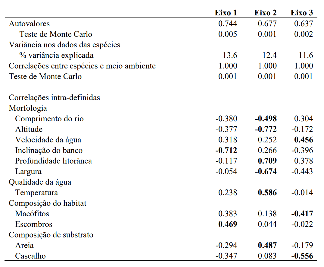 Tabela 3. São apresentadas as variáveis ambientais e a composição dos peixes no presente estudo (apenas variáveis correlacionadas com um determinado eixo são mostradas).