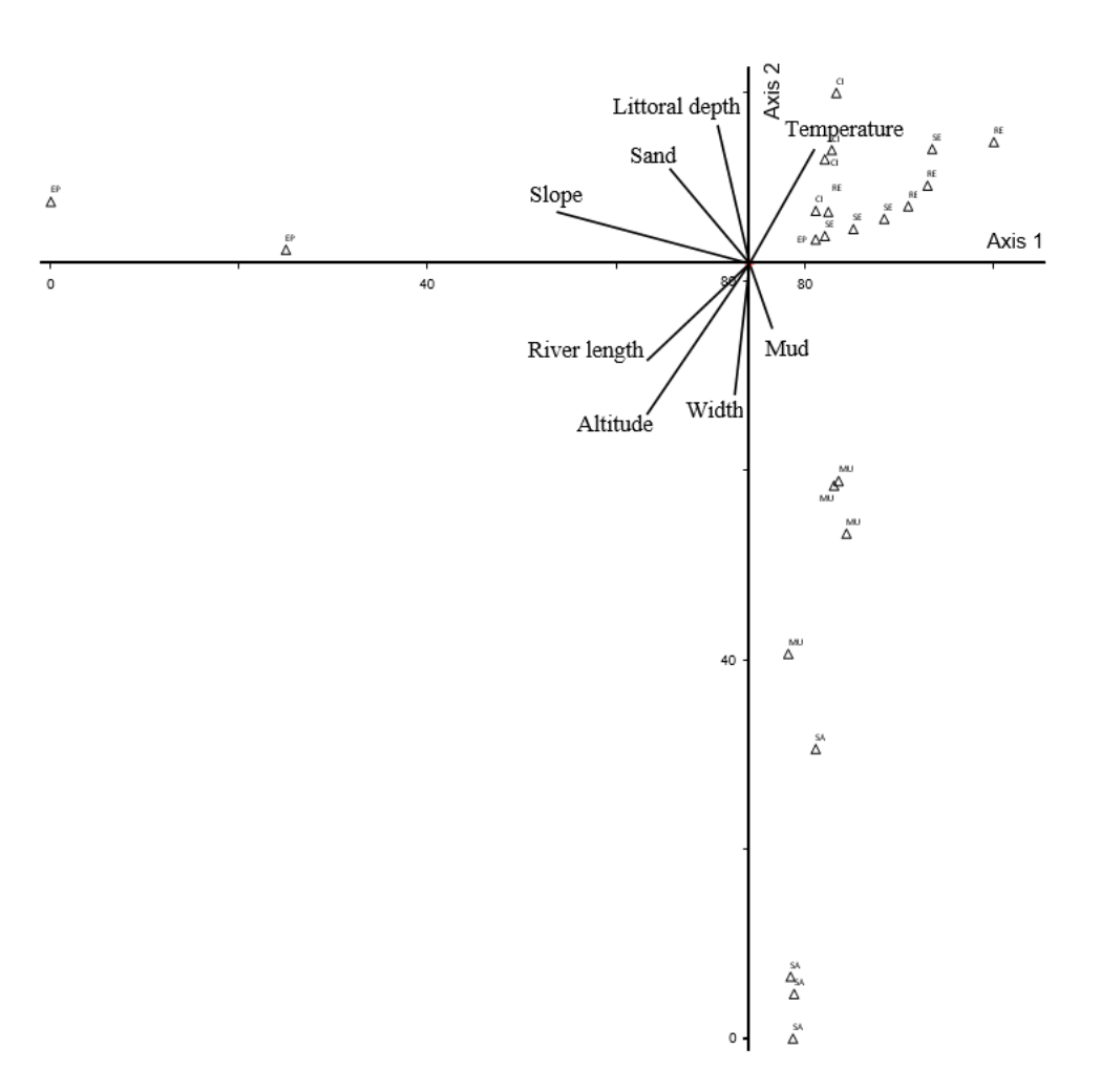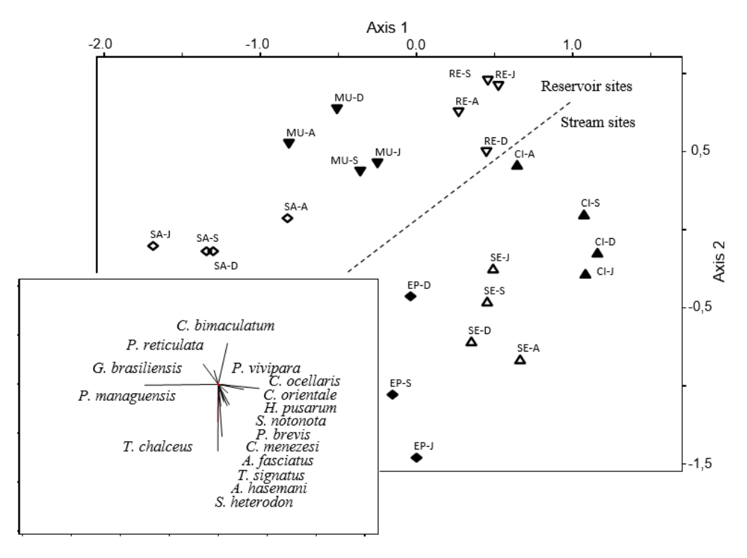Figura 3. Biplot de CCA mostrando a composição de conjuntos de peixes nos locais e ocasiões de amostragem () e as variáveis ambientais explicativas definidas pela CCA.