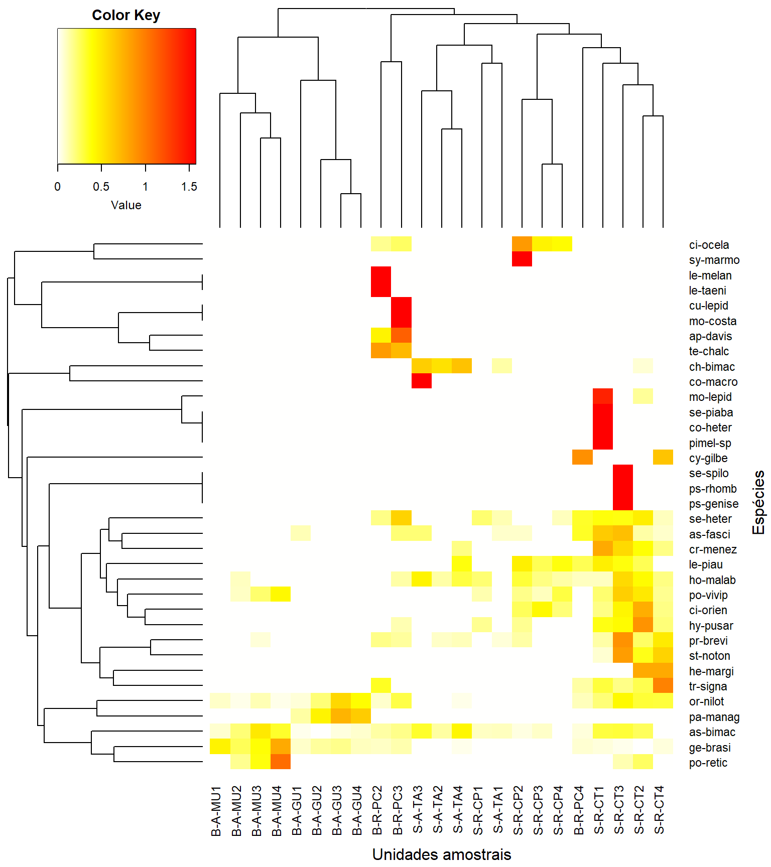 xlab = "Unidades amostrais", ylab = "Espécies",