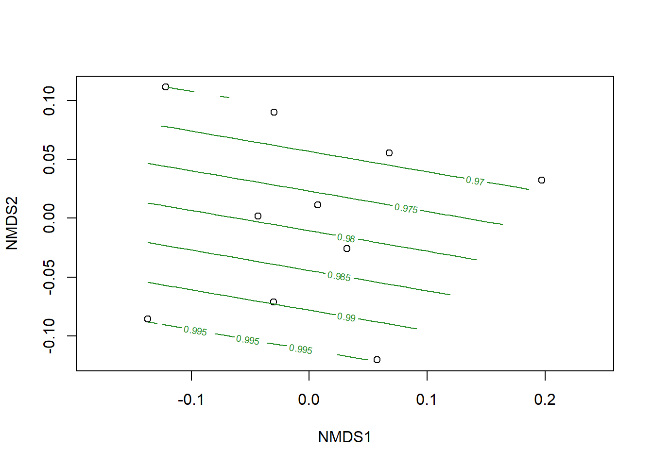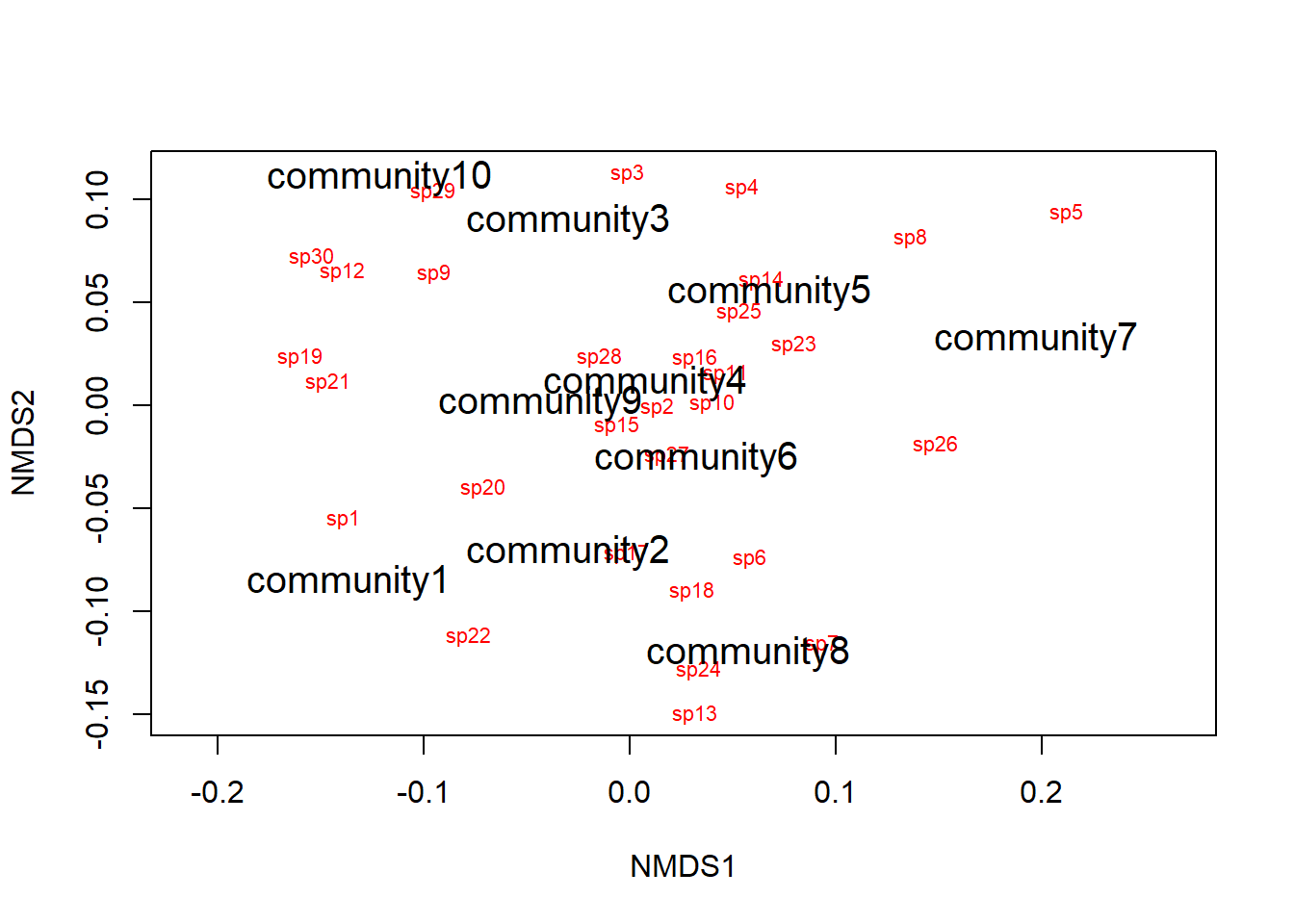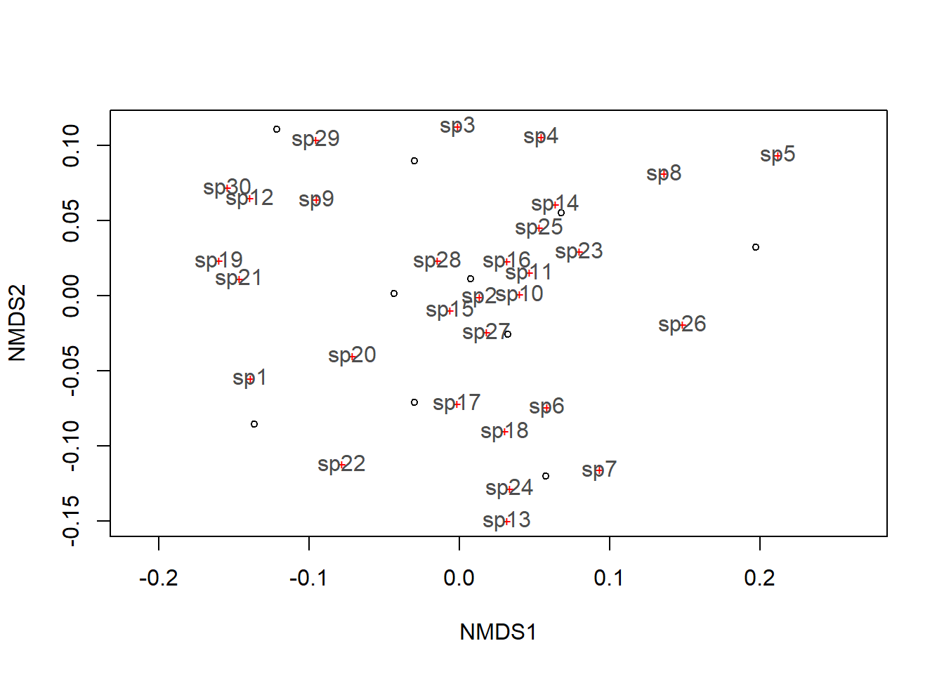 Nesse exemplo, metaMDS aplicou automaticamente uma transformação da raiz quadrada e calculou as distâncias de Bray-Curtis para a matriz de comunidade-por-local.