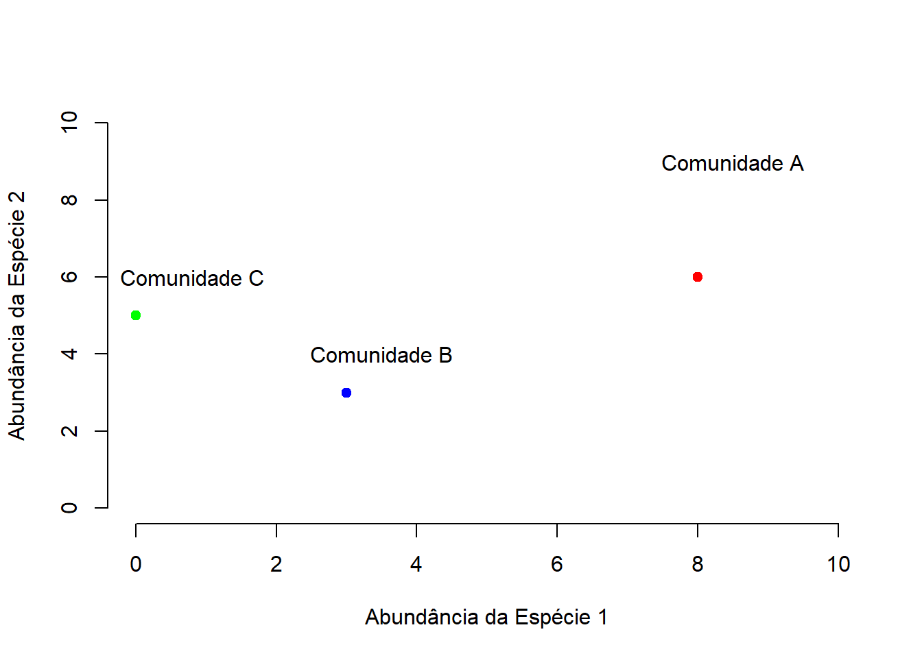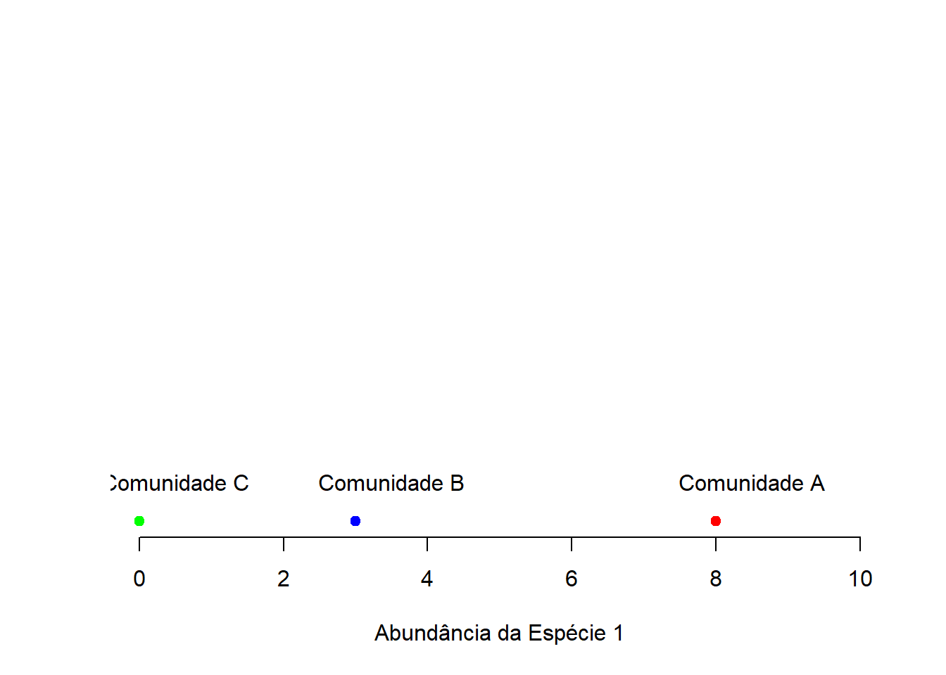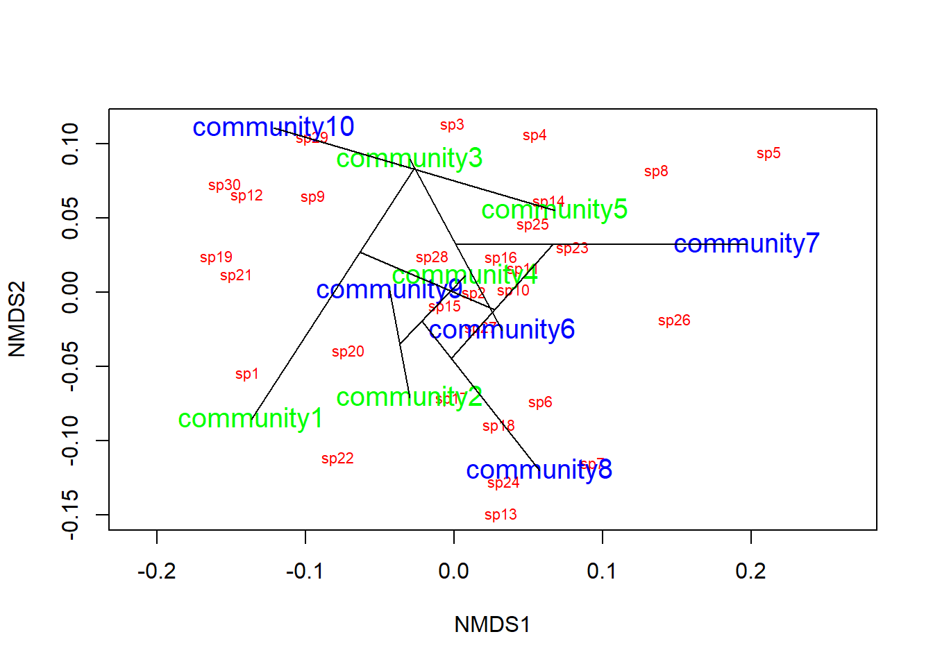 Nesse exemplo, metaMDS aplicou automaticamente uma transformação da raiz quadrada e calculou as distâncias de Bray-Curtis para a matriz de comunidade-por-local.