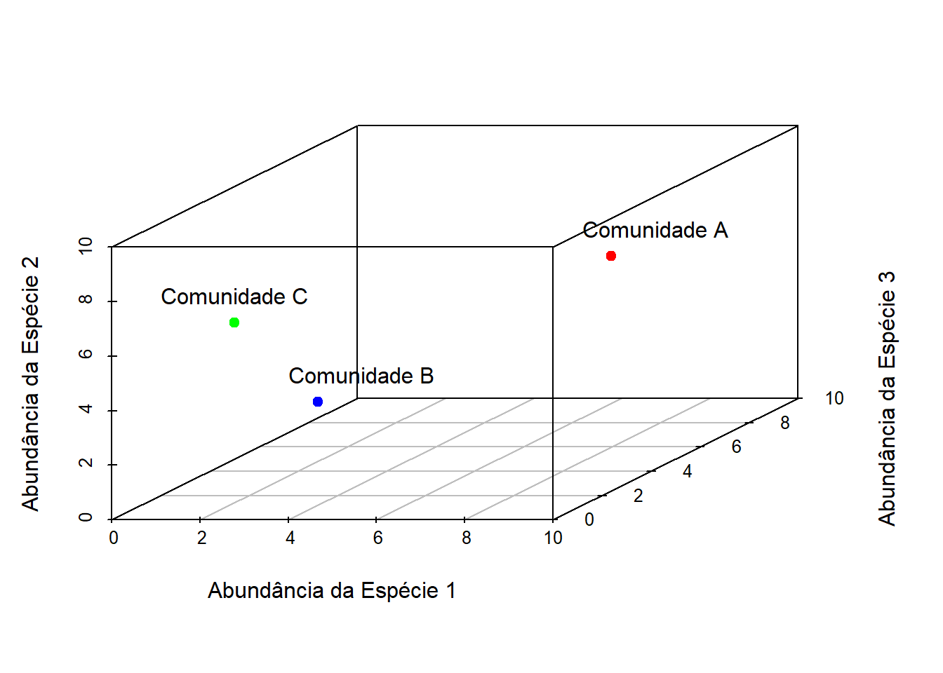 A ordenação mostra tanto as comunidades (“locais”, círculos abertos) quanto as espécies (cruzes vermelhas).