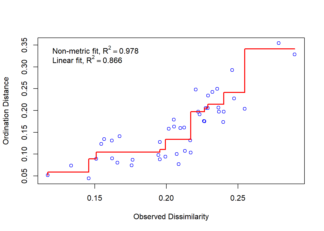 É necessário examinar o Gráfico de Shepard, que mostra a dispersão em torno da regressão entre as distâncias entre pontos da configuração final (distâncias entre cada par de comunidades) versus as dissimilaridades originais.