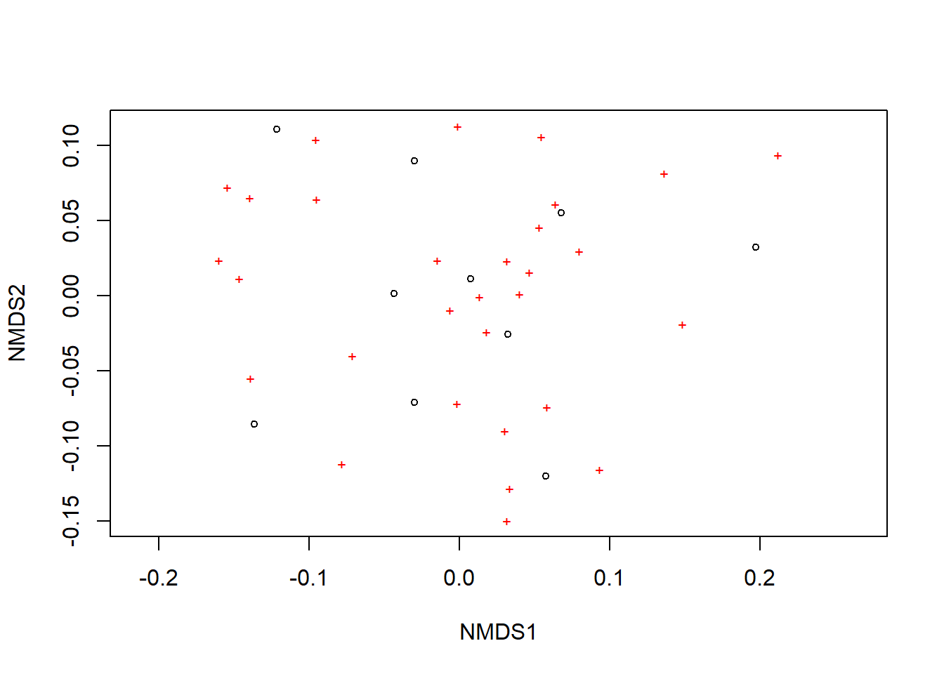 Deve-se observar cada iteração do NMDS até que uma solução seja alcançada (ou seja, o stress foi minimizado após algum número de reconfigurações dos pontos em 2 dimensões). Pode-se aumentar o número padrão de iterações usando o argumento trymax =. Isso pode ajudar a aliviar problemas de não convergência. Se o stress for alto, pode-se aumentar o número de dimensões para k = 3.
