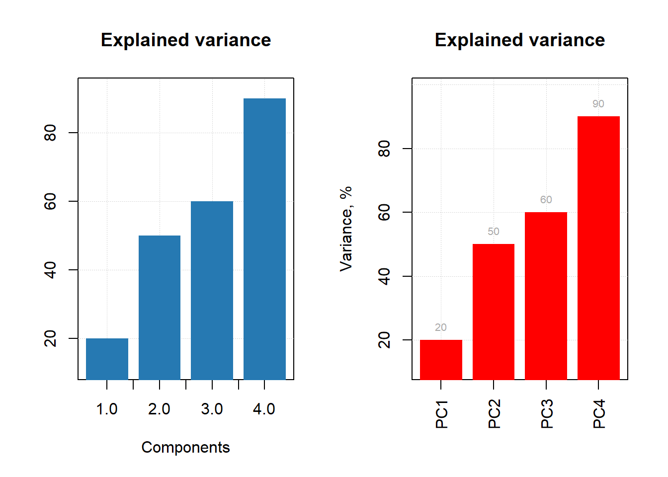 show.labels = TRUE, labels = "values", xlas = 2, xlab = "", ylab = "Variance, %")