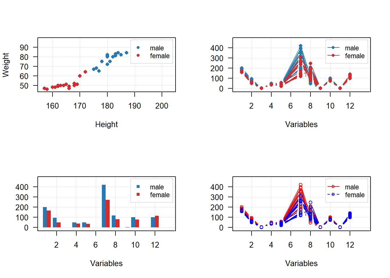 mdaplotg(d, type = "b", lty = c(1, 2), col = c("red", "blue"), pch = 1)