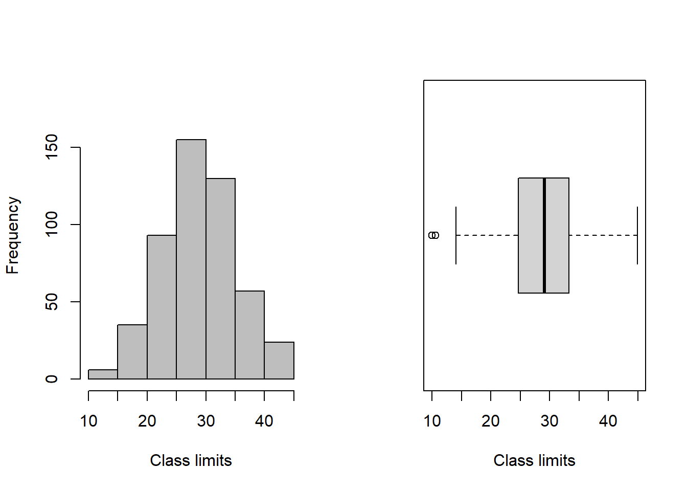 No código abaixo se define o layout dos gráficos para serem exibidos lado a lado, e na sequência criamos um gráfico de histograma com base na tabela de frequência tf. O comando boxplot() cria um gráfico de boxplot para os valores em brotos_v. O argumento “horizontal = TRUE” indica que o boxplot deve ser horizontal.