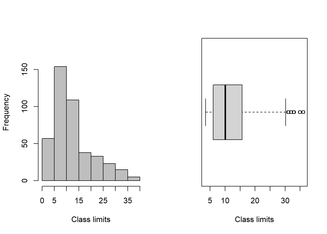 #var_sub <- var_v[var_v>=5 & var_v <=15] #vectorPara fazermos uma tabela de frequência dos valores merísticos carregamos o pacote fdth e pedimos a função range que retorna o valor máximo e mínimo no vetor.